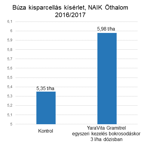 Az Öthalmon beállított NAIK 4 ismétléses kisparcellás kísérletben (2017/18), már az egyszeri YaraVita Gramitrel 3 l/ha-al kijuttatva, átlagosan 630 kg-al több termést adott a kontrollhoz képest (2.ábra). A kezelés költségét levonva (középárfolyamon kalkulált búza ár), mely 148 kg búzával egyenértékű, a nettó terméstöbblet 482 kg volt hektáronként. Ez pesszimista búza árral számolva 24 000 Ft, optimista közelítésben 30 000 Ft feletti nettó többletbevételt biztosít hektáronként, ha YaraVita Gramitrelt használunk a lombtrágyázás során. Érdemes számolni!