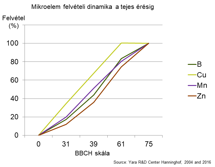 Napjainkban a modern mezőgazdaság fontos része a mérés és vizsgálatokra alapozott tápanyagellátás. Az eredmények elemzése az első lépés a szakszerű választáshoz. A Liebig elvet követve, a mikroelem kijuttatással a makroelemek hatékonyságát is növeljük. Ez különösen fontos a csökkenő komplex műtrágya használat mellett. A minőségi búza előállítása természetesen nem nélkülözheti a többi agrotechnikai elem (talajművelés, vetéstechnológia, növényvédelem, betakarítás) optimalizálását. Az talaj mikroelemszolgáltatása és a szervesanyag tartalom között szoros összefüggés van. A szervesanyag a talajokban csökkenő tendenciát mutat, ezért a mikroelemeket pótolni kell. A Yara hanninghofi bázisán szántóföldi kísérletben vizsgálták az őszi búza mikroelem-felvétel dinamikáját. Az ábrán látható, hogy a bokrosodástól a tejesérésig gyakorlatilag konstans emelkedett a felvett mikroelemek mennyisége (1.ábra).