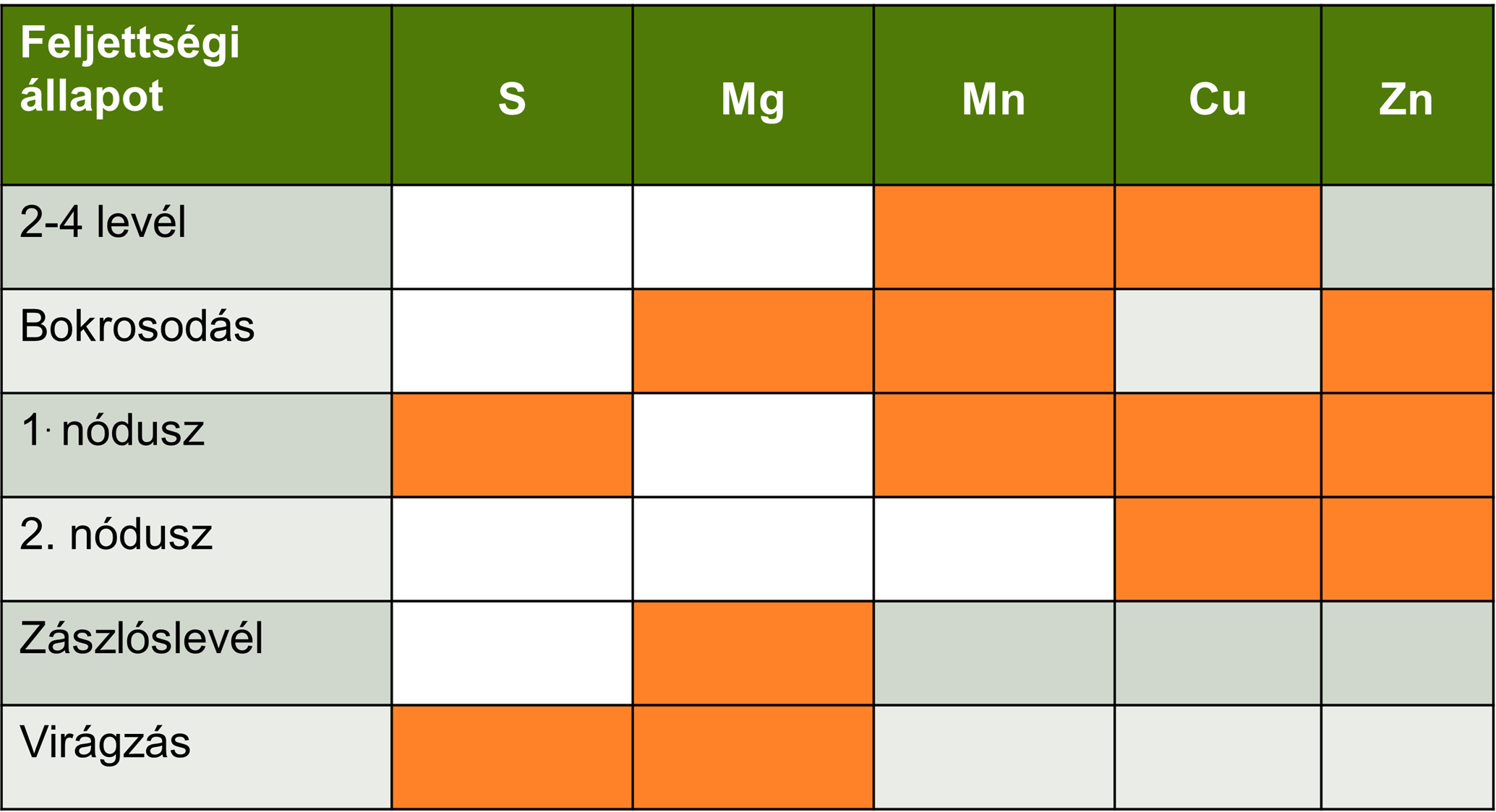 Az első növényvédelmi munkálatokkal célszerű a növények kondicionálását is elvégezni a tankkeverékben lombtrágya alkalmazásával. Elmaradt őszi alaptrágyázás, lassan melegedő talaj esetén az első javaslat egy magasabb foszfortartalmú lombtrágya használata, hogy az energiatermelő folyamatokat segítve erősítsük meg növényeinket. Erre a YaraVita KombiPhos vagy a YaraVita Zeatrel korai fenológiában 2-3 l/ha dózisú alkalmazása nyújt segítséget. Az ezt követő kezelés már a jól bevált, növényspecifikus összetételű YaraVita lombtrágyák következzenek. A kalászosokban a YaraVita Gramitrel 2-4 l/ha dózisban tartalmazza azokat a fontos mikroelemeket, arányukat és mennyiségüket is tekintve, amellyel a magasabb terméselvárásoknak is megfelel az alkalmazása. A kijuttatás lehetőleg a kalászosok 2 szárcsomós állapotáig történjen meg, mivel ez az az időszak, amelyben fellépő tápelemhiányok a legnagyobb kiesést okozhatják (táblázat).
